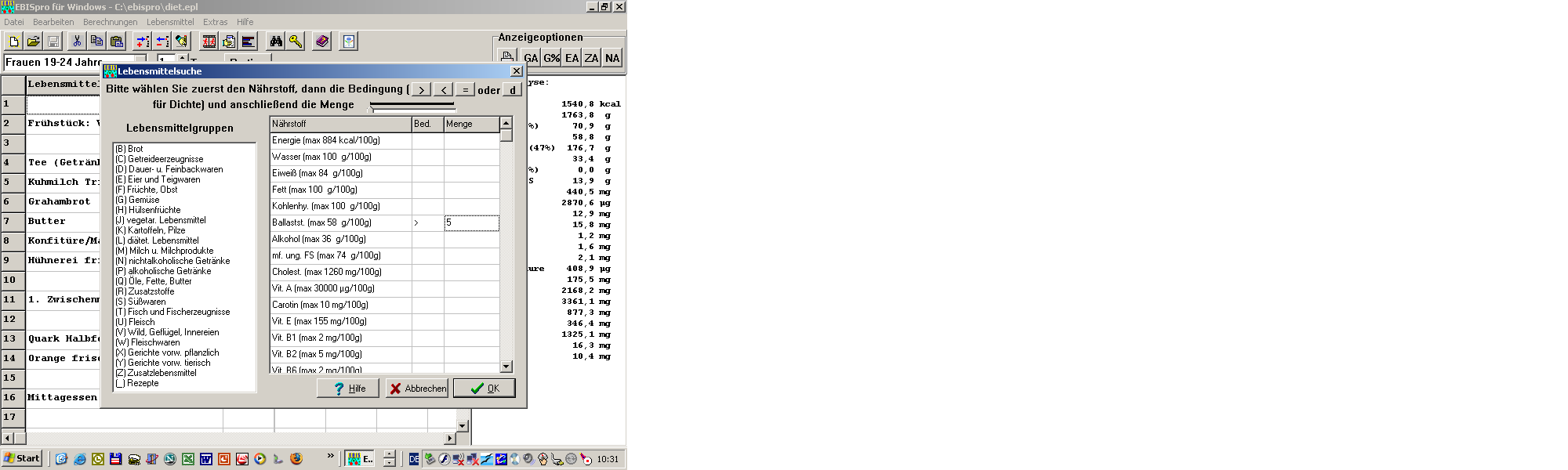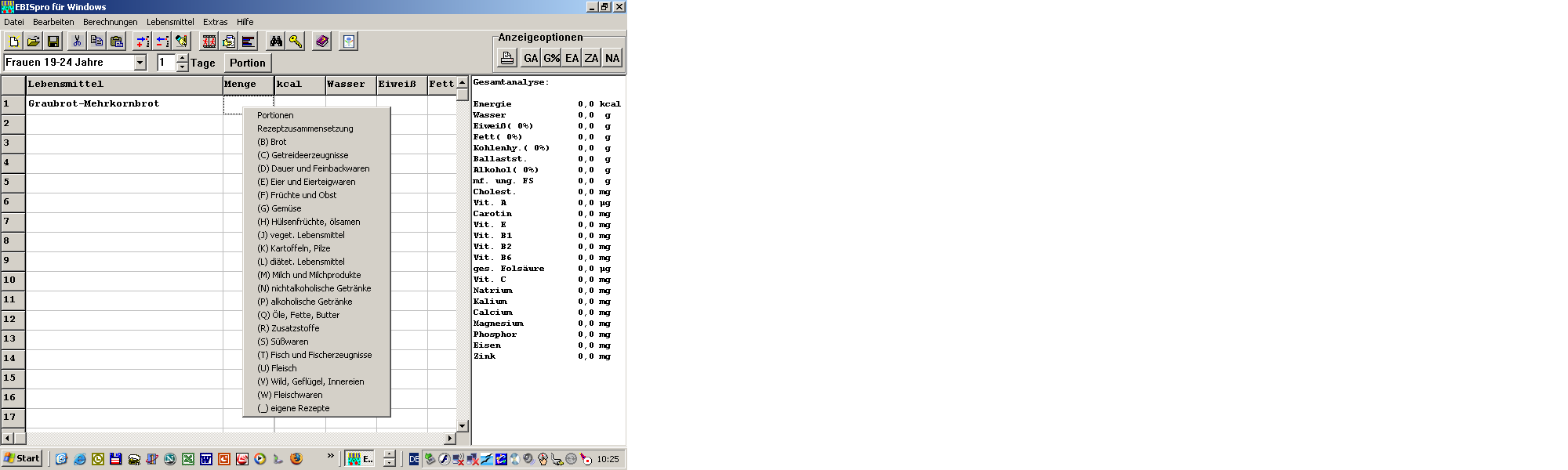 Im Arbeitsblatt haben Sie die Möglichkeit, Lebensmittel auf mehrere verschiedene Arten einzugeben: Über einen Teil des Lebensmittelnamens, die Nummer des Lebensmittels oder einfach über die Lebensmittelgruppen.