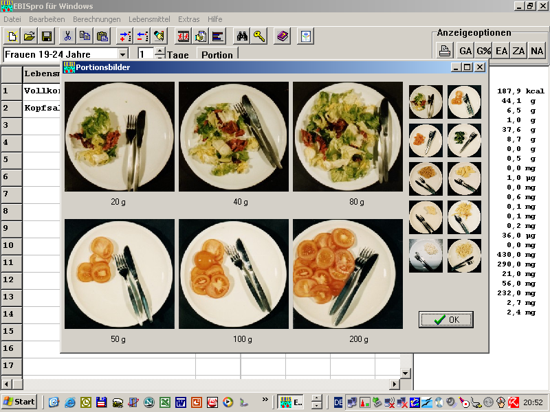Neben Standardportionsgrößen können Sie auch Portionsbilder aufrufen und die entsprechenden Mengen übernehmen. Anschließend sehen Sie im rechten Bildteil sofort die Änderungen bei den Nährstoffangaben. Die wichtigsten Funktionen des Programms erreichen Sie direkt über die entsprechenden Buttons in der Symbolleiste.