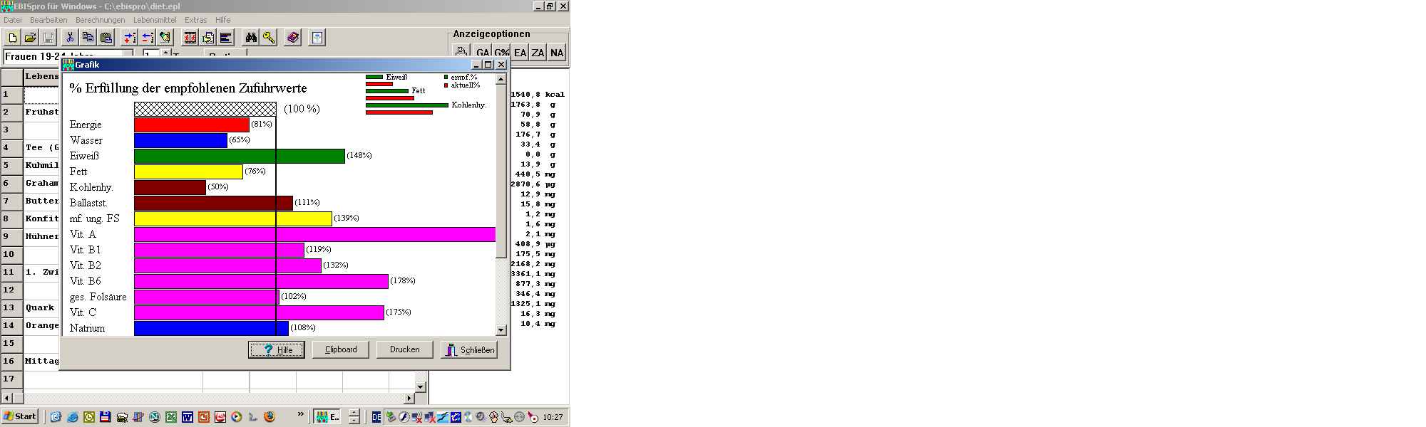Nach der Eingabe eines Ernährungsplans können Sie diesen anhand einer Grafik mit den Empfehlungen der DGE vergleichen.