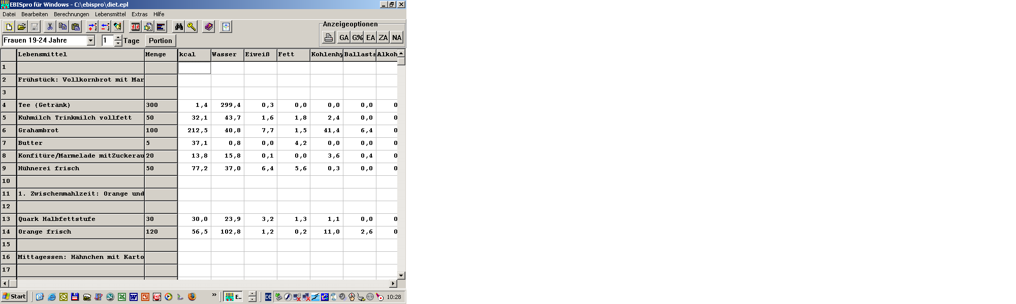 Im Arbeitsblatt haben Sie mehrere Möglichkeiten, die Anzeige zu verändern, z.B. wie hier die Lebensmittel zu fixieren, um für jedes Lebensmittel die einzelnen Nährstoffe zu sehen.