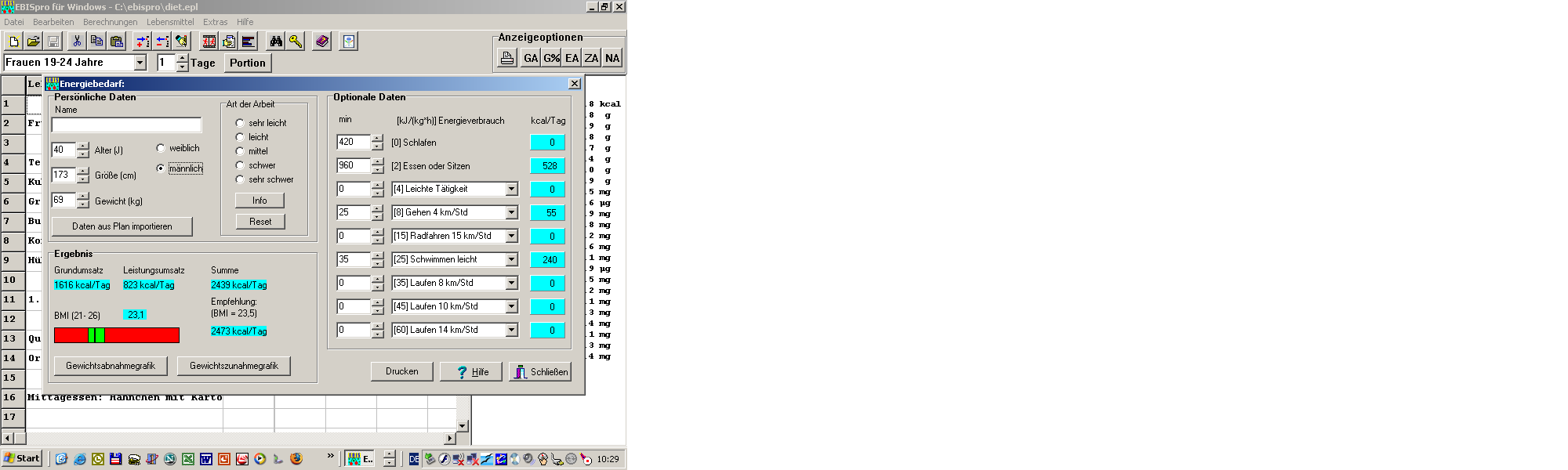 In EBISpro können Sie außerdem eine detaillierte Energiebedarfsrechnung durchführen. Zusätzlich können Sie die Zeit berechnen, um im Rahmen einer Reduktionsdiät auf ein bestimmtes Gewicht zu kommen.