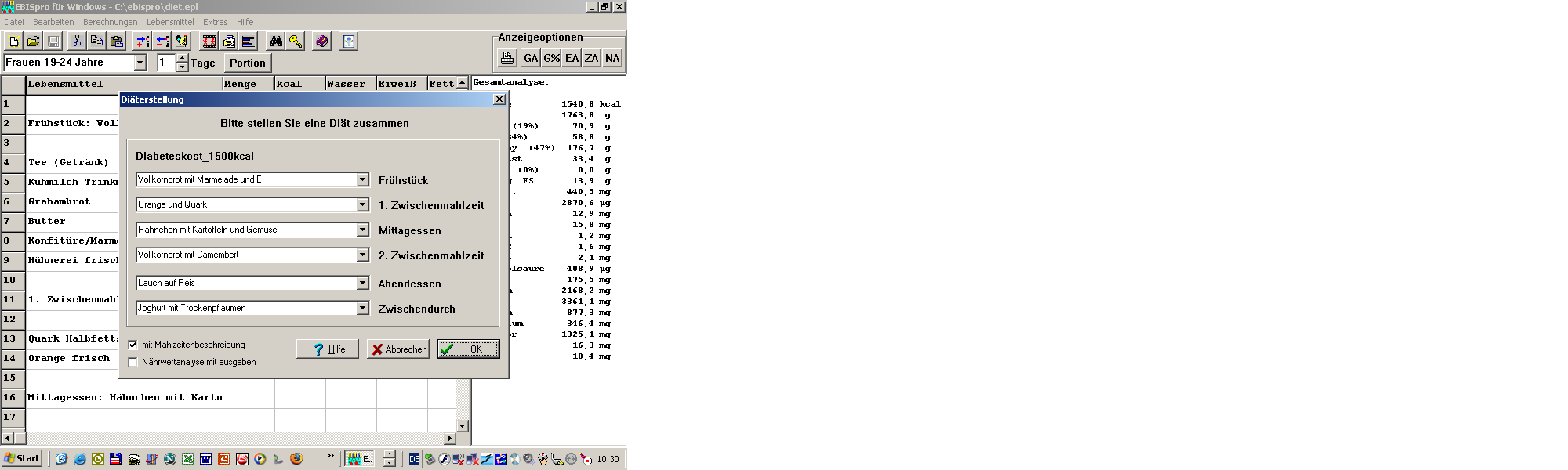EBISpro beinhaltet mehrere Diäten, deren Komponenten aus einer Vielzahl von Möglichkeiten individuell zusammengestellt werden können. Daneben gibt es eine automatische Diäterstellungsfunktion, in der quantitative Angaben wie Energie oder Kohlenhydrate genau bestimmt werden können und zusätzlich qualitative Restriktionen wie vegetarisch etc. eingehalten werden.