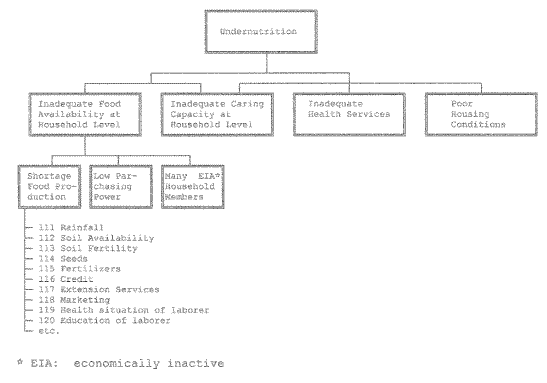 The major causes of poverty and poor nutritional conditions are described in the following problem tree (Diagram 1). This problem tree presents only some factors and describes the related causes only for one branch. The analysis thus attempts to extract typical perspectives of the situation which in reality is very complex. These characteristics then become tangible and can be analyzed and worked on by the team of specialists.